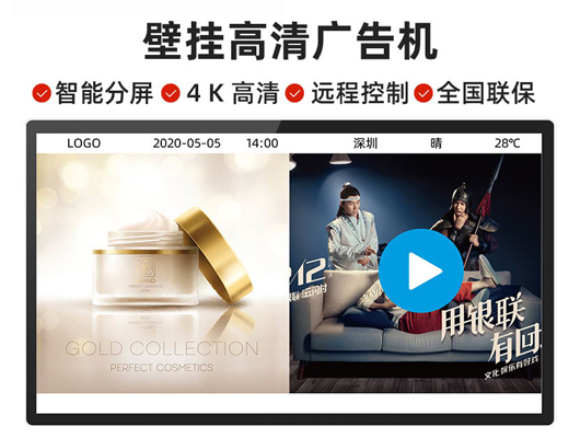 容大彩晶液晶廣告機(jī)是一種全新的媒體播放產(chǎn)品,可壁掛、吊掛、懸掛、橫豎通用的高清液晶廣告機(jī),一般應(yīng)用在大型商場(chǎng)、超市、酒店大堂、飯店、影院及其他人流匯聚的公共場(chǎng)所等。壁掛廣告機(jī)網(wǎng)絡(luò)版可通過(guò)USB、TF卡輸入播放節(jié)目信息,還可以連接網(wǎng)絡(luò),進(jìn)行遠(yuǎn)程操控及管理;可設(shè)置多時(shí)段定時(shí)開關(guān)機(jī),無(wú)需專人職守;可遙控設(shè)置,操作方便并提高保密性;雙重防盜,配備門鎖保護(hù),防止多媒體卡被盜和文件內(nèi)容的泄漏;是當(dāng)前廣告?zhèn)髅降闹髁餍问健?/p>